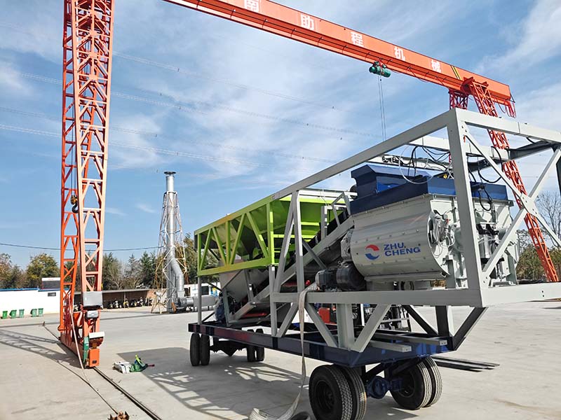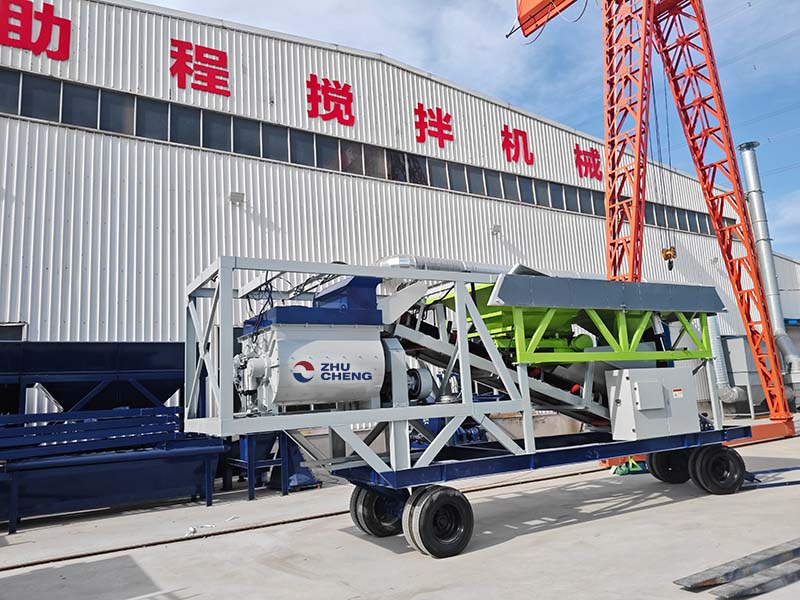 YHZS25 belt conveyor mobile concrete mixing plant adopts a JS500 double horizontal shaft concrete mixer, batching machine adopts a PLD800 batching machine, the theoretical output is 25 cubic meters per hour.